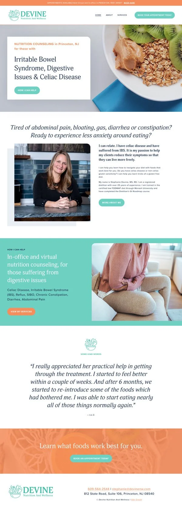 I’d like to tell you about a recent successful project. Stephanie Devine, a practitioner specializing in irritable bowel syndrome and celiac disease, operates out of Princeton, New Jersey, both virtually and in-person. Stephanie was searching for a web designer for her private practice, Devine Nutrition and Wellness.
