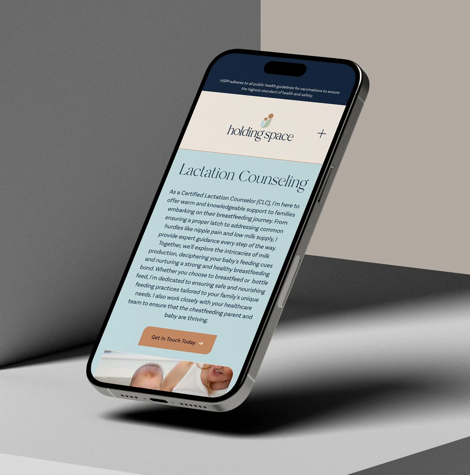 Deliverables included full brand identity assets (logo variations, brand pattern, fonts, and color palette), business cards, a letterhead, a quarter-page ad, and training support for ongoing updates. The finished doula website design aligns beautifully with her mission to “hold space” for families during a deeply personal time.