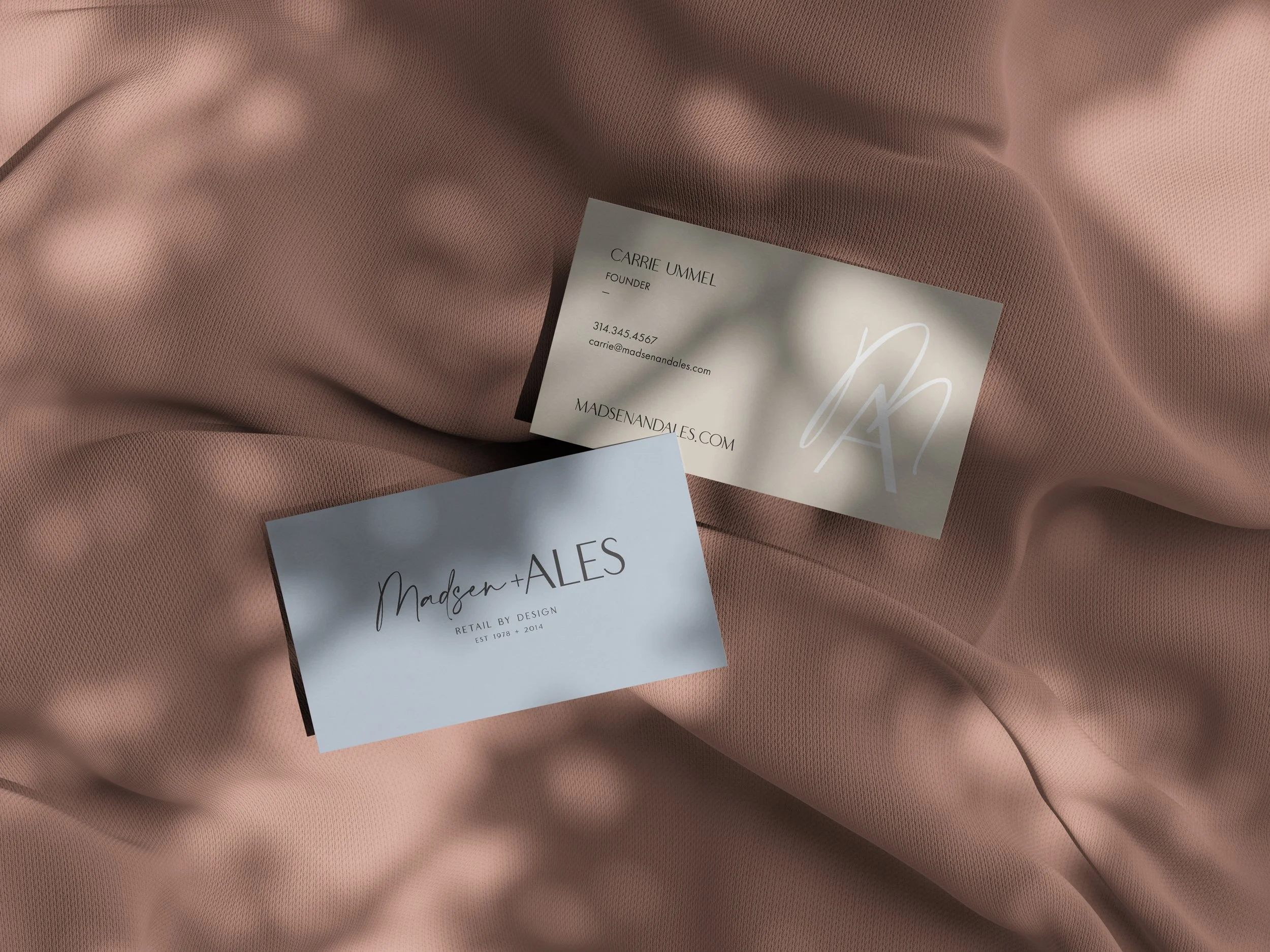 The branding process began with a strong emphasis on sophistication and personalization. The client provided a thoughtfully curated color palette that aligned with her refined aesthetic, serving as the foundation for the design. This personal touch extended to the logo design, where the name "Madsen + Ales" represents the client and her mother. To reflect this connection, we combined a hand-drawn script with a modern sans-serif font, symbolizing the blend of personal warmth and contemporary luxury.