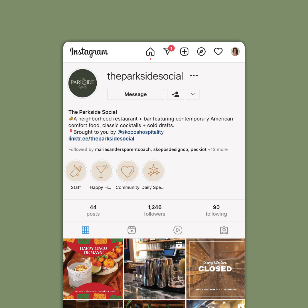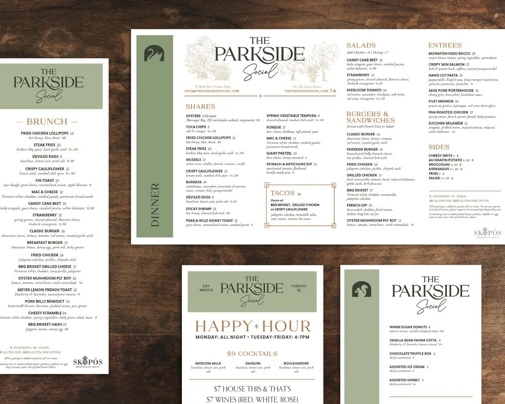 The Parkside Social is a classic American tavern with modern touches, located in Verona, New Jersey. To match the unique atmosphere of the location, I developed a comprehensive branding system that blends traditional American tavern elements with contemporary flair. The design inspiration was drawn from the interior design, guided by a mood board from the creative director. I carefully selected a color palette derived from the venue's interior choices and wallpaper, which contributed to a cohesive and inviting atmosphere. The playful incorporation of animal marks—such as a swan, deer, and squirrel—was a nod to the nearby landmark park in Verona, tying the brand name “Parkside” to the local environment.